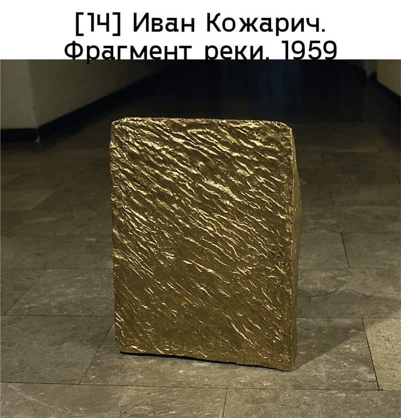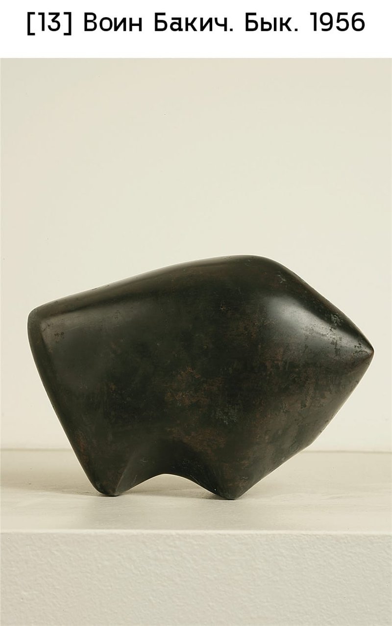 Вытеснение академического реализма разными модернистскими стилями происходило и в югославской скульптуре. Выставленный на конкурс проект памятника Марксу и Энгельсу (1951–1952) Воина Бакича, выделялся своей кубистской направленностью, простотой и чистотой монументального языка, заметными также в его Быке (1956) [илл. 13]. Ольга Еврич обратилась к абстракции в середине 1950-х годов, применяя цемент и железо для создания композиций неправильной формы, которые напоминали глыбы, пронзенные металлическими прутьями; пример тому – Взаимодополняющие формы (1956–1957). В работах из цикла Металлическая скульптура, начатого в 1959 году, Душан Джамоня использовал готовые изделия, такие как гвозди, пронизывая ими дерево или глиняную массу: эта нетрадиционная техника подчеркивала материальность и объем. Ивана Кожарича волновали не столько дебаты о фигуративном и абстрактном искусстве, сколько тонкие исследования пластических качеств окружающего мира, как, например, в его Фрагменте реки (1959) [илл. 14].