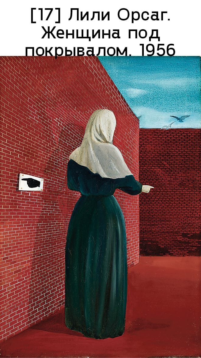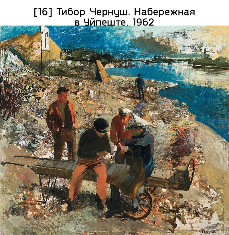 Венгерские деятели искусства, в ответ на требование соответствовать диктату социалистического реализма, взяли на вооружение разнообразные стратегии. Многие в начале 1950-х годов выбрали внутреннюю эмиграцию: это касается, например, большинства участников «Европейской школы», которые революционной осенью 1956 года ненадолго попытались возобновить коллективную деятельность. Другие вели «двойную бухгалтерию», работая в жанре социалистического реализма при выполнении государственных заказов и продолжая создавать модернистские произведения в своих мастерских. Те, кто искренне принял социалистический реализм, остались у разбитого корыта, когда мир искусства обратился против дискредитировавшего себя стиля и его поборников. Постсоцреалистический фигуративизм, в котором натуралистические образы сочетались с объектами из некоего нереального или магического мира, позднее названного сюрнатурализмом, полнее всего воплотился в творчестве Тибора Чернуша. На его картинах мы видим обыденные городские сцены, лишенные всякого утопического пафоса, среди них – Набережная в Уйпеште (1962), изображающая, как апатичные люди играют в карты на замусоренном берегу реки в пригороде [илл. 16]. Лили Орсаг в своих полотнах того времени, оставаясь в границах зримой реальности, обращается к традициям сюрреализма, чтобы выразить чувство отчуждения и тревоги. Это заметно в Женщине под покрывалом (1956), где одинокая женская фигура стоит среди кричащих краснокирпичных стен [илл. 17]. Лошонци в конце 1950-х годов работал в своей мастерской над Великой очистительной бурей, где различные сюжеты закручиваются в спиральном вихре – эффектно передавая расстройства, надежды и воспоминания художника, связанные с разгромленным восстанием 1956 года.