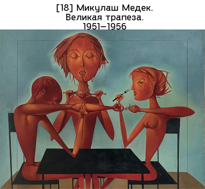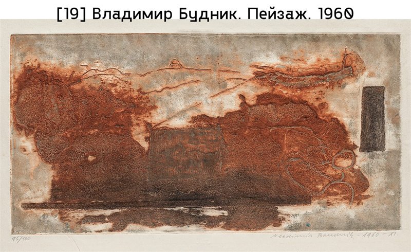 В чешских землях художники обходили диктат социалистического реализма, обращаясь в тишине своих мастерских к наследию сюрреализма. Так было, например, с Микулашем Медеком, продолжившим традиции «Чешской сюрреалистической группы» после смерти Тейге в 1951 году; к концу десятилетия он начинает склоняться к более структурно выраженному живописному стилю. Его полотна передавали экзистенциальную тревогу – признак времени – с помощью гротескных, стилизованных образов, как, скажем, в Великой трапезе (1951–1956), где обед превращается в акт саморазрушения [илл. 18]. Своим уникальным путем шел Владимир Будник, в своих манифестах, начиная с конца 1940-х годов, он развивал идеи «эксплозионализма» – теории, выросшей из размышлений над колоссальными переменами, возвещенных веком атома. Утверждая, что каждый способен к необузданному творческому самовыражению, он провел несколько уличных акций в Праге, объясняя свои принципы прохожим при помощи узоров, которые возникли на обветшавших фасадах зданий. Будник, гравер по образованию, работавший на заводе, экспериментировал с техниками «активной» или «структурной» графики, применяя отходы, которые подбирал в цеху, – щепки, металлические опилки, куски веревки или ткани, даже пыль, – для создания абстрактных композиций с богатой текстурой [илл. 19].