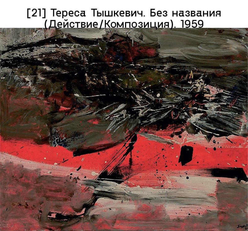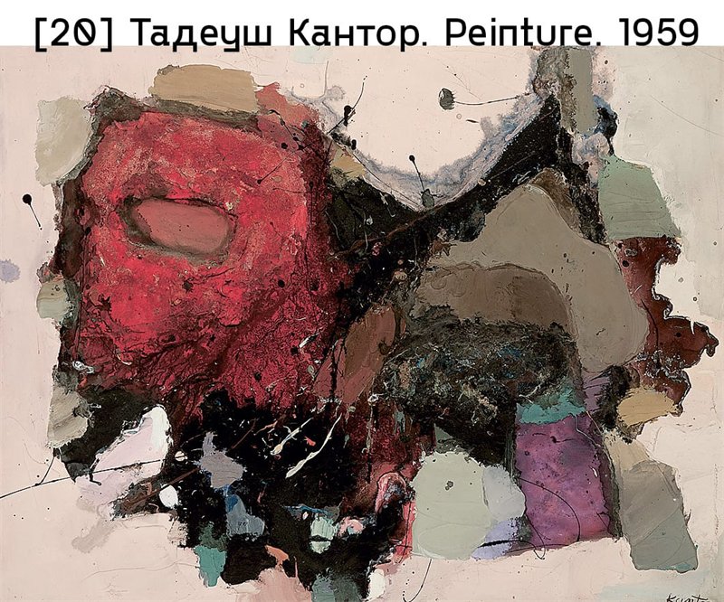 В Чехии к этому направлению примкнули такие художники, как Зденек Беран, Истлер, Медек, Антонин Томалик и Иржи Валента, который в конце 1950-х годов принялся наносить на холст различные материалы и использовал густой слой черной краски для создания скупых экспрессивных работ. Алеш Веселы в 1959 году начал создавать абстрактные «картины-предметы» из подобранных им материалов, обрабатывая поверхность работ при помощи пламени. Неприемлемое для партийных цензоров неформальное течение заявило о себе двумя выставками Столкновения, устроенными художником Яном Кобласой в Праге (1960) в частных мастерских. В Польше эта тенденция оформилась благодаря Кантору, источником вдохновения для которого стала поездка в Париж, совершенная в 1956 году: он начал писать пастозные абстрактные полотна с четким ритмом и буйными цветами [илл. 20]. В статье 1957 года Абстракция мертва, да здравствует абстракция! Кантор обосновывал свои эксперименты в области жестуальной абстракции, обращаясь к враждебным ему критикам: он утверждал, что мир, где властвуют силы абсурда, хаоса, мятежа и иррациональности, можно постичь только нерациональными средствами – инстинктом и эмоциями. Среди польских адептов неформального искусства стоит назвать также Бжозовского, Геровского, Ежи Куявского, Альфреда Леницу и Тышкевич, выражавших свое душевное состояние путем экспрессивного обращения с материалом [илл. 21].