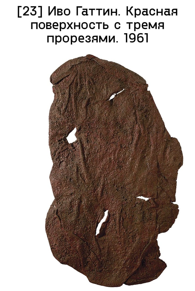 Неформальное искусство получило широкое распространение и в Югославии, первые работы были представлены в 1957 году на персональных выставках сербского скульптора Ольги Еврич [илл. 22] и хорватского художника Иво Гаттина. В Белграде представителями этого стиля были также Бранко Протич, Мича Попович и Вера Божичкович-Попович, утверждавшие антиэстетику грубых спонтанных фактур, залитых жидкой черной краской. Более радикальные позиции занимали загребцы Мариян Евшовар, Джуро Седер, Эуген Феллер и Гаттин, чей антиживописный и антиреференциальный подход привел к систематическому разрушению холста. Гаттин пошел дальше всех: он наносил на холст цемент, песок, смолу, воск, а затем уничтожал его, обливая бензином и поджигая, как в работе Красная поверхность с тремя прорезями (1961) [илл. 23]. В своем эссе Новый материал (1957) художник привлекает внимание к беспрецедентному воздействию промышленных материалов и индустриального антуража на традиционные техники, замечая: «В отношении многих современных картин мы без преувеличения можем сказать, что завод является их соавтором».