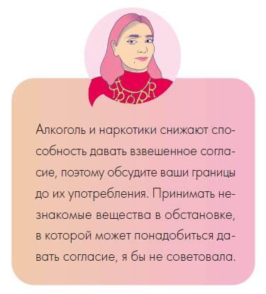 Секс неразрывно связан с согласием. Всякий раз, когда я в книге пишу «спросите партнера» или «поговорите с партнером», то подразумеваю практическое применение согласия. Это не один решительный разговор, к которому вы больше не вернетесь. Он должен стать началом, за которым последует множество уточнений, изменений, корректировок и переговоров, причем вы всегда можете отозвать какую-то часть согласия или отменить его целиком. Согласие можно давать и отзывать до, во время и после секса.