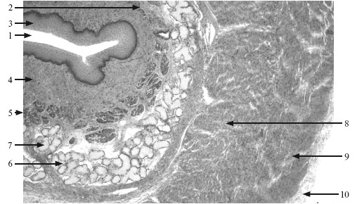 1 – просвет пищевода; 2 – слизистая оболочка; 3 – многослойный плоский неороговевающий эпителий; 4 – собственная пластинка; 5 – мышечная пластинка; 6 – подслизистая основа; 7 – собственные железы; 8 – внутренний циркулярный слой мышечной оболочки; 9 – наружный продольный слой; 10 – адвентициальная оболочка.