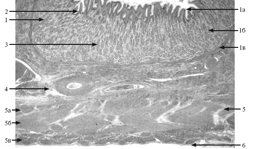1 – слизистая оболочка: 1а – железистый эпителий, 1б – собственная пластинка, 1в – мышечная пластинка; 2 – желудочные ямочки; 3 – собственные железы; 4 – подслизистая основа; 5 – мышечная оболочка: 5а – внутренний косой слой, 5б – средний циркулярный слой, 5в – наружный продольный слой; 6 – серозная оболочка.
