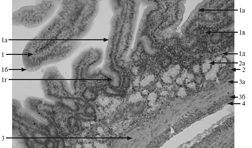 1– слизистая оболочка (ворсинка): 1а – однослойный призматический (каемчатый) эпителий, 1б – бокаловидные клетки, 1в – собственная пластинка, 1 г – крипта, 1д – мышечная пластинка; 2 – подслизистая основа: 2а – дуоденальные железы; 3 – мышечная оболочка: 3а – внутренний циркулярный слой, 3б – наружный продольный слой; 4 – адвентициальная оболочка.