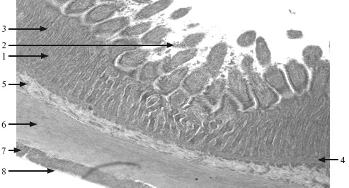 1 – слизистая оболочка; 2 – эпителий; 3 – собственная пластинка с криптами; 4 – мышечная пластинка слизистой оболочки; 5 – подслизистая основа; 6 – внутренний циркулярный слой мышечной оболочки; 7 – наружный продольный слой мышечной оболочки; 8 – серозная оболочка.