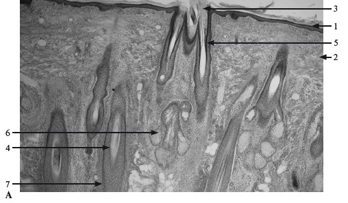 1 – эпидермис; 2 – дерма; 3 – стержень волоса; 4 – корень волоса; 5 – наружное волосяное влагалище; 6 – сальные железы; 7 – волосяной фолликул.