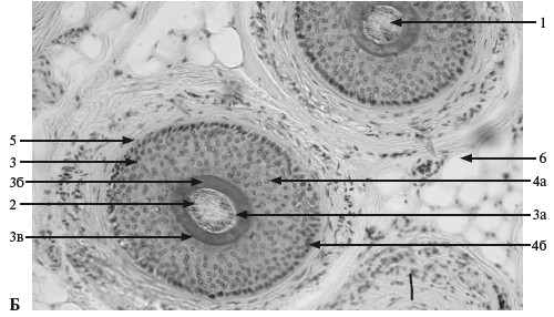 1 – мозговое вещество волоса; 2 – корковое вещество; 3 – внутреннее эпителиальное влагалище: 3 а – кутикула, 3б – слой Гексли, 3в – слой Генле; наружное эпителиальное влагалище: 4а – шиповатый слой, 4б – базальный слой; 5 – волосяная сумка; 6 – жировая ткань.