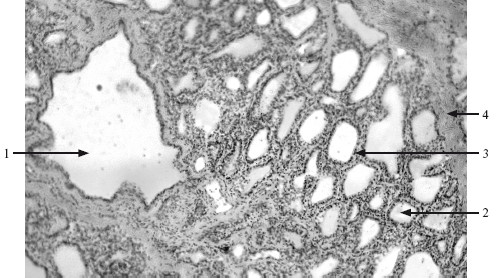 1 – млечный ход; 2 – концевой отдел; 3 – экзокриноциты; 4 – соединительно-тканная перегородка.
