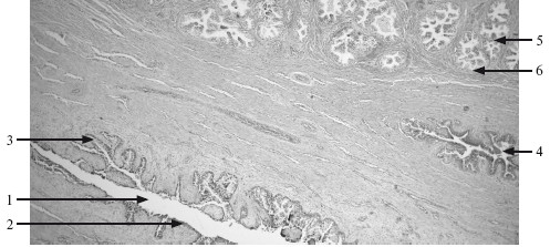 1 – уретра; 2 – переходный эпителий; 3 – слизистые (внутренние периуретральные) железы; 4 – подслизистые (наружные периуретральные) железы; 5 – главные железы (концевые отделы); 6 – пучки гладко-мышечных клеток.