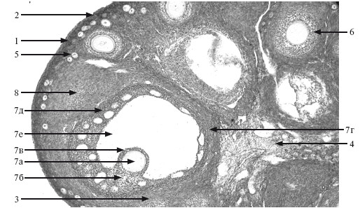1 – белочная оболочка; 2 – мезотелий; 3 – корковое вещество; 4 – мозговое вещество; 5 – примордиальные фолликулы; 6 – первичный (поздний) фолликул; граафов пузырек: 7а – овоцит I порядка, 7б – яйценосный бугорок, 7в – лучистый венец, 7 г – наружная тека, 7д – внутренняя тека, 7е – полость фолликула; 8 – желтое тело.