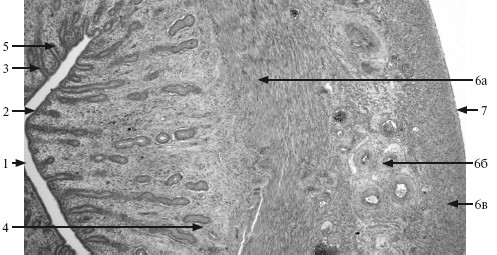 1 – просвет; 2 – эпителий; 3 – простые трубчатые железы матки; 4 – базальный слой; 5 – функциональный слой; миометрий: 6а – подслизистый слой, 6б – сосудистый слой, 6в – надсосудистый слой; 7 – периметрий.