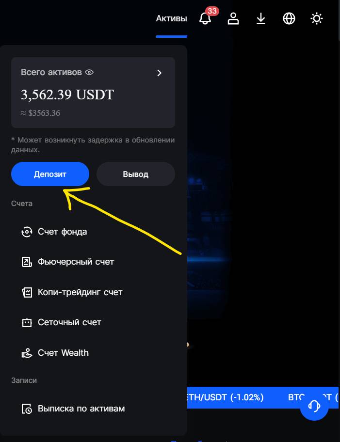 Обратите внимание, что на бирже есть несколько отдельных видов счетов – счет фонда, стандартный фьючерсный, бессрочный фьючерсный, копитрейдинг и т.д. В любой момент можно переводить активы между ними мгновенно и без комиссии, нажав кнопку «Перевод».