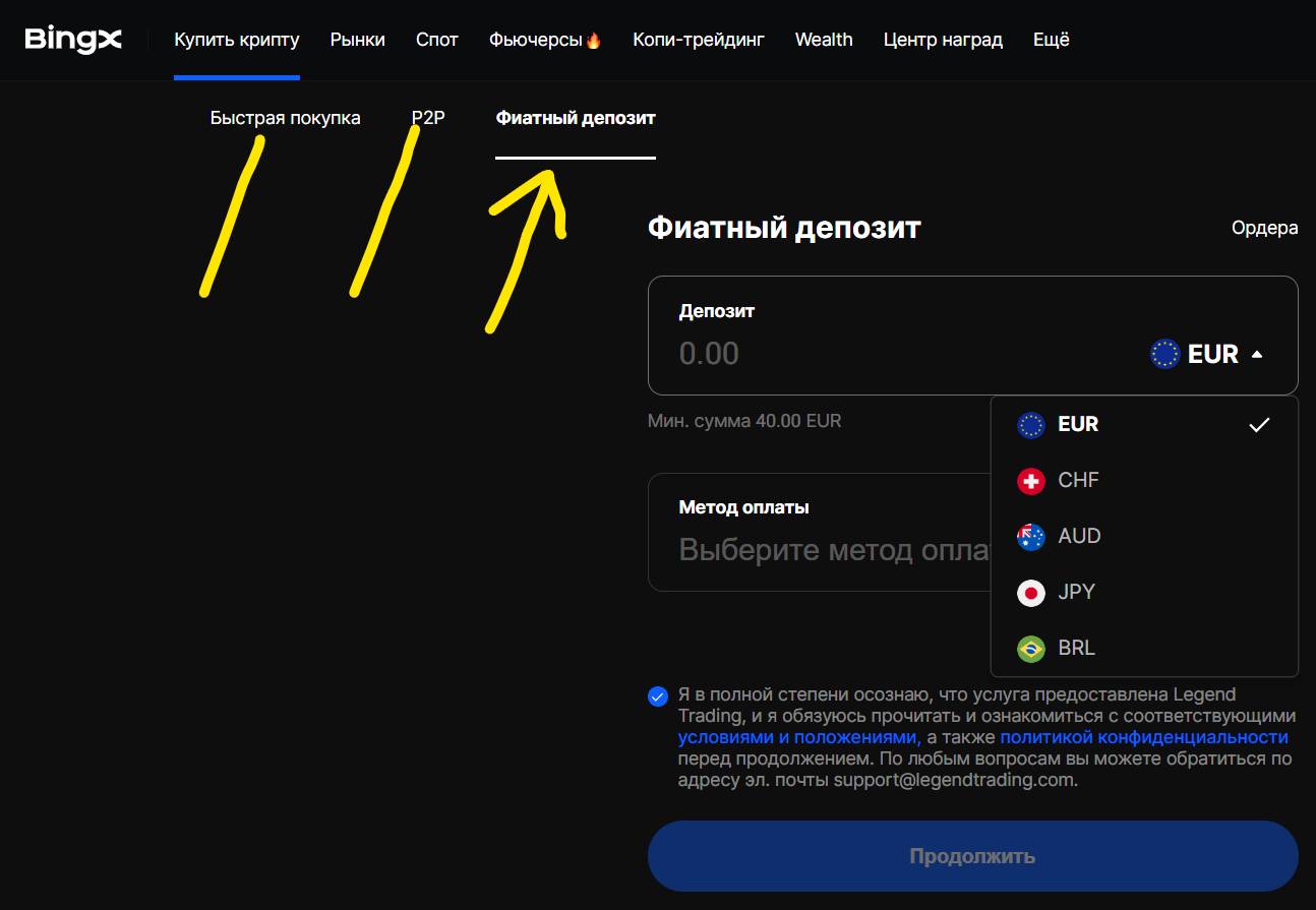 Есть возможность покупки криптовалюты на BingX с карты или AdvCash.