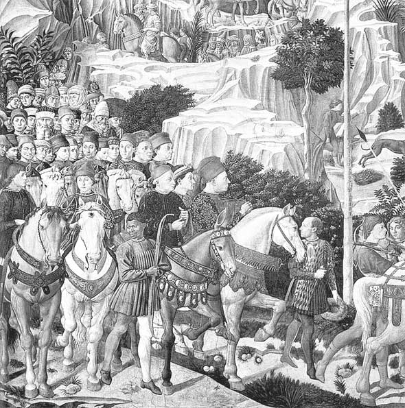 Герцог Галеаццо Мария Сфорца (предположительно) на фреске Беноццо Гоццоли «Шествие волхвов». 1459–1460. Капелла Волхвов палаццо Медичи – Рикарди (Флоренция)