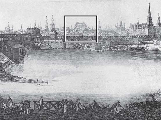 В устройстве Опричного двора по Штадену тоже опознается некая праформа знакомой композиции Пашкова дома: три мощные постройки под гербовыми орлами, развернутыми грудью к земщине – Кремлю, и переходы на столбах вокруг покоев и до стен.