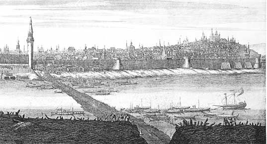 Осада Константинополя турками в 1453 году. Книжная миниатюра. XV век. Слева, за Золотым Рогом, – Галата