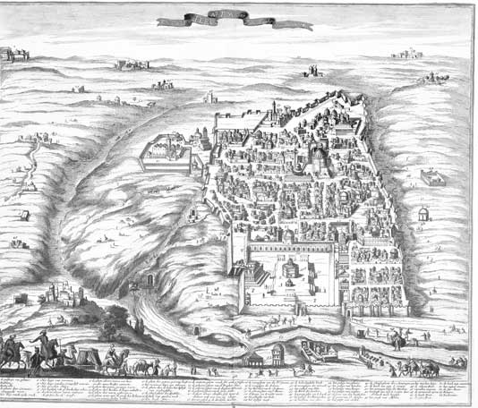 Иерусалим. План XVII века, исполненный в Амстердаме. Британская библиотека. План ориентирован на запад. Вид от Елеона. Внизу – Иосафатова долина с потоком Кедрон. За Золотыми воротами, к которым ведет дорога от моста, – Храмовый двор с мечетью Купол Скалы на месте Второго Храма. Левее (южнее) Храмового двора – опустевший холм Офель с выходами подземелий города Давидова. В центре выделяется храм Гроба Господня на вошедшей в городскую черту Голгофе. В линии западной (дальней) стены – Цитадель (Башня Давида). Левее (к югу от нее), в особой ограде, – Сионская Горница