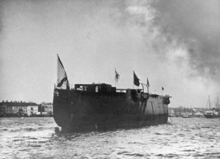 Из-за большой длины корабля к эллингу достроили временный навес, который, однако, закрыл корпус не полностью, и форштевень с гербом был виден ещё при подходе к заводской проходной на Галерной улице.