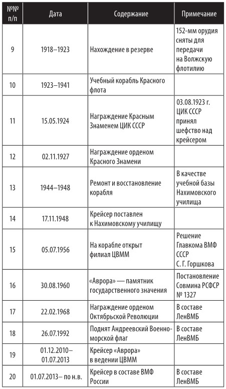 Крейсер за свою службу прошел более 100 тысяч миль, участвовал в трех войнах, пережил долговременную консервацию и участь быть разобранным на металлолом; даже испытал на себе распад страны. Но крейсер «Аврора», превысив допустимый срок эксплуатации корабля более чем в 4 раза, до сих пор в строю ВМФ России. Такое долголетие флагмана отечественного исторического флота объясняется многими обстоятельствами, как политическими, так и техническими, в частности, проведением регулярных ремонтов корабля, направленных на поддержание его технического состояния, и периодических докований с целью обследования подводной части корпуса.