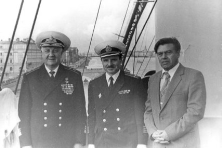 Слева направо – главный наблюдающий ВМФ, В.Н.Буров, старший офицер ГТУ ВМФ Б.А.Суханов, заместитель Главного строителя В.М.Иванов