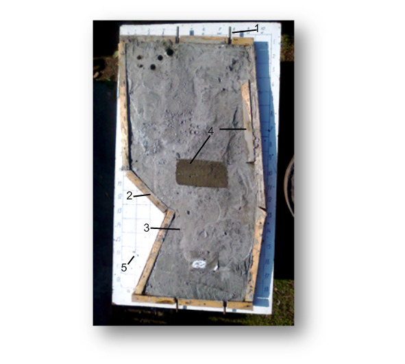 1 – арматура; 2 – бруски опалубки; 3 – бетон; 4 – деревянные бруски, замещающие бетон; 5 – основание.