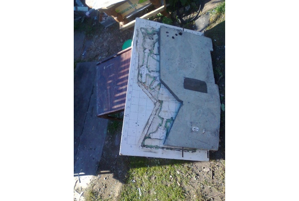 2.2.3. Удаление макета из формы проводится следующим образом. Основание с формой медленно опускается с подставки (журнальный стол) на землю под некоторым углом (фото 20 а), при этом форма самостоятельно скатывается вниз под своей тяжестью, затем форму переворачивают лицевой стороной вверх (фото 20 б), укладывают на землю и удаляют макет из формы. Сначала в любом месте отверткой или стамеской аккуратно разрушают часть макета до внутренней стороны формы, а затем постепенно удаляют всю остальную массу макета. Поскольку внутренняя сторона формы смазана отработкой, то части макета отделяются от формы легко. В дальнейшем разрушенные части макета больше не понадобятся. После очистки пустой формы от частиц макета ее укладывают на подставку (фото 20 в) для дальнейшей обработки.