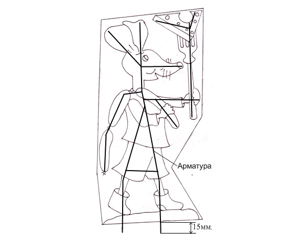 Между собой отрезки металлической арматуры скрепляются электрической сваркой. В качестве арматуры можно использовать любые отрезки стальной проволоки диаметром от 3 до 10 мм. При сваривании узлов арматуры, чтобы не повредить внутреннюю поверхность формы от расплавленных частиц металла, внутреннюю поверхность ее закрывают небольшими листами жести. Другой способ защиты поверхности формы от расплавленных частиц – покрытие частей формы песком, который после изготовления арматурного скелета удаляется пылесосом. Сварку отрезков арматуры можно также осуществлять вне формы на ровной поверхности металлического листа, на котором предварительно мелом нарисовать схему, согласно рисунку 21. Если нет возможности использовать сварку, арматуру можно связывать стальной мягкой или медной проволокой. При отсутствии арматуры ее можно заменить на стеклопластиковые прутки (помидорные палочки), которые в местах соединения также скрепляются проволокой. Для улучшения сцепления с бетоном на стеклопластиковые прутки желательно нанести напильником или бруском наждачного станка риски (выемки) на глубину 1—1,5 мм вкруговую по спирали. В нижней части фигуры концы арматуры должны выступать на 15—20 см для установки и закрепления скульптуры в грунт. В носовой части скульптуры «МЫШКА» в качестве усов закрепляют небольшие отрезки тонкой стальной проволоки, которые затем отгибаются в разные стороны.