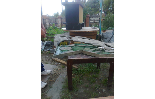 2.2.2. Заполнение опалубки бетоном проводится следующим составом: 1/4 часть песка, 1/4 часть глины, 1/4 часть мелкого гравия (щебня), 1/4 часть цемента М400. В качестве наполнителя вместо гравия и щебня лучше использовать керамзит фракции не более 10 мм. В этом случае, фигура не теряя прочностных свойств будет несколько легче. Часть песка (половина объема) можно заменить на древесные опилки. После смешивания сухих компонентов в смесь добавляется вода. Раствор приготавливается до консистенции жидкой сметаны. Опалубка заполняется раствором заподлицо с брусками (фото 19), после чего изделие накрывается влажной мешковиной и вместе с основанием помещается в тень. Если нет подходящей емкости, раствор удобнее приготовлять в садовой тачке, предварительно закрепив ее для устойчивости. После окончательного затвердевания бетона (2—3 суток в зависимости от температуры окружающей среды) производится удаление макета, выполненного в соответствии с разделом 2.1 из формы.