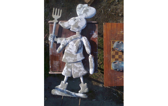 2.3.3. Слабым местом в данной фигуре является крепление вилки к лапке мыши. Чтобы не повредить этот узел (в других фигурах таких слабых мест нет), можно поступить следующим образом: перед заполнением формы бетоном в лапку необходимо поместить отрезок трубки диаметром 20—25 мм и длиной 10 см, который прочно приваривается сваркой к арматуре, а затем, после установки формы по месту в грунт, в трубку вставляется вилка, флажок, цветок или другой элемент, изготовленный, например, из фанеры. Другой вариант – это изготовление «Мышки» без вилки по рисунку 22. В этом случае конструкция фигуры упрощается, но теряется часть смыслового значения (где был добыт сыр мышкой?).
