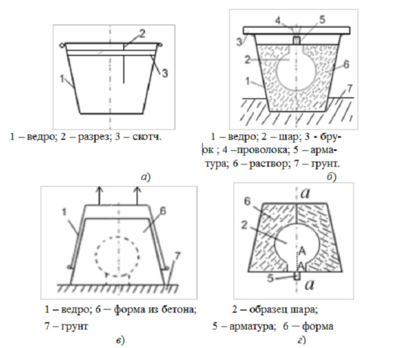 – в ведро помещают образец шара 2 и закрепляют его с помощью проволоки 4 к бруску 3 за конец арматуры 5 (шары продаются с арматурой);
