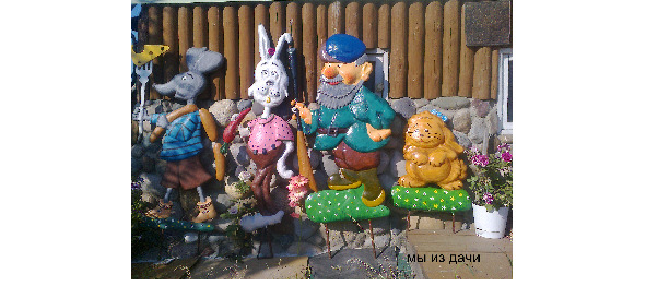 В заключение можно добавить, что составленные композиции из различных фигур могут с успехом использоваться на фасадах дачных строений, детских игровых площадках, на дворовых территориях и т.п., например, композиция «МЫ ИЗ ДАЧИ» (Фото 27) изготовлена и установлена автором на фасаде бани приусадебного участка.