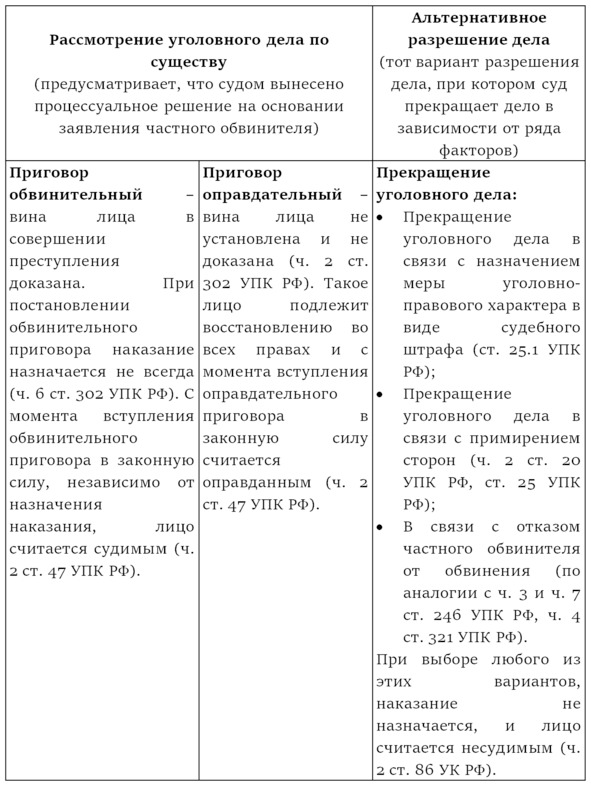 Представленная схема характерна и ориентирована, в первую очередь, на дела частного обвинения. При рассмотрении уголовных дел частно-публичного и публичного обвинения, альтернативные способы разрешения дела будут отличаться. Перечисленные способы разрешения дела чаще всего встречаются в судебной практике. Очень редко можно встретить иные основания прекращения уголовного дела, поэтому остановимся детально и рассмотрим несколько иную классификацию последствий разрешения дела по указанным основаниям.
