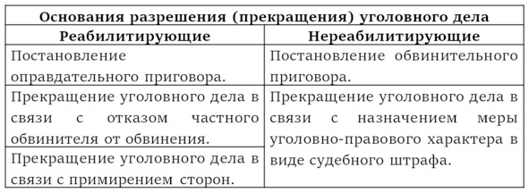 В п. 2.2. Постановления КС №16-П от 14.07.2011 указано, что прекращение уголовного дела по нереабилитирующему основанию возможно лишь в случае получения согласия подозреваемого (обвиняемого) на прекращение уголовного дела. Применительно к делам частного обвинения, основания разрешения (прекращения) уголовного дела можно классифицировать следующим образом.