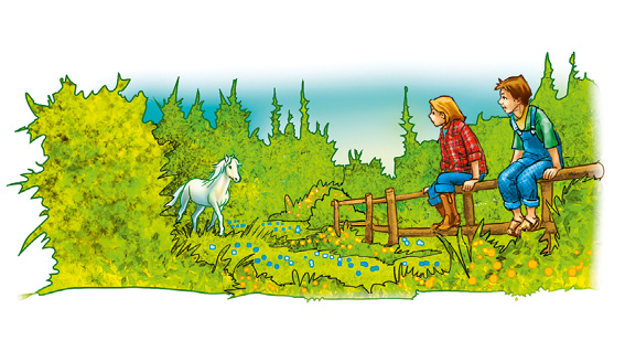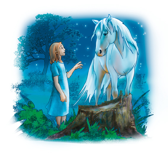 Ребята взобрались на забор и стали ждать. Совсем скоро они услышали топот и между деревьями показался конь. Яна не смогла вымолвить ни слова: он был просто невероятно красив! Его белоснежная грива сияла на солнце. Конь бежал так грациозно, будто летел, не касаясь земли. Он остановился в нескольких метрах от ребят, тряхнул гривой и посмотрел своими сверкающими голубыми глазами прямо на Яну.