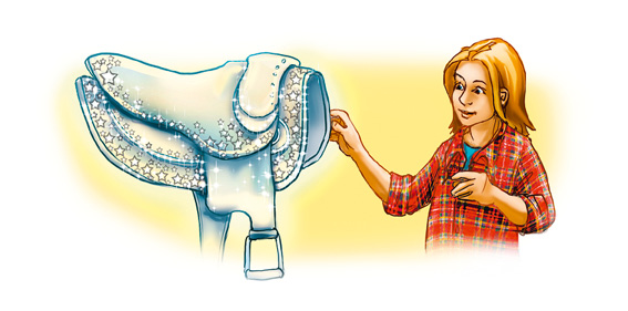 Госпожа Фиттье прошла в конюшню и достала белое кожаное седло, на котором сверкали тысячи серебряных звёздочек и камней.