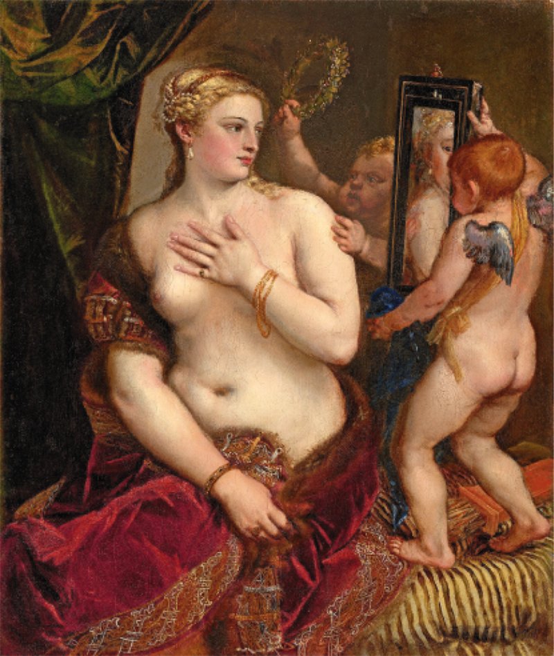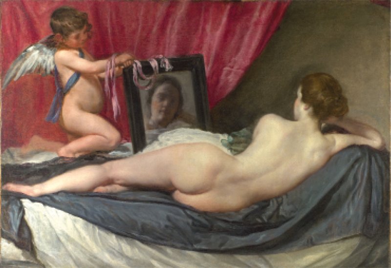 Обнаженная Венера, обращенная спиной к зрителю, лежит на шелковых простынях. Она смотрит на себя в зеркало, которое держит крылатый купидон, а красный занавес служит для них фоном. Все великолепно: бархатистая кожа, плавные соблазнительные изгибы, ленточка, витиевато наброшенная на зеркало. Ждет ли обольстительная красавица возлюбленного или наслаждается своим совершенством уже после его ухода?
