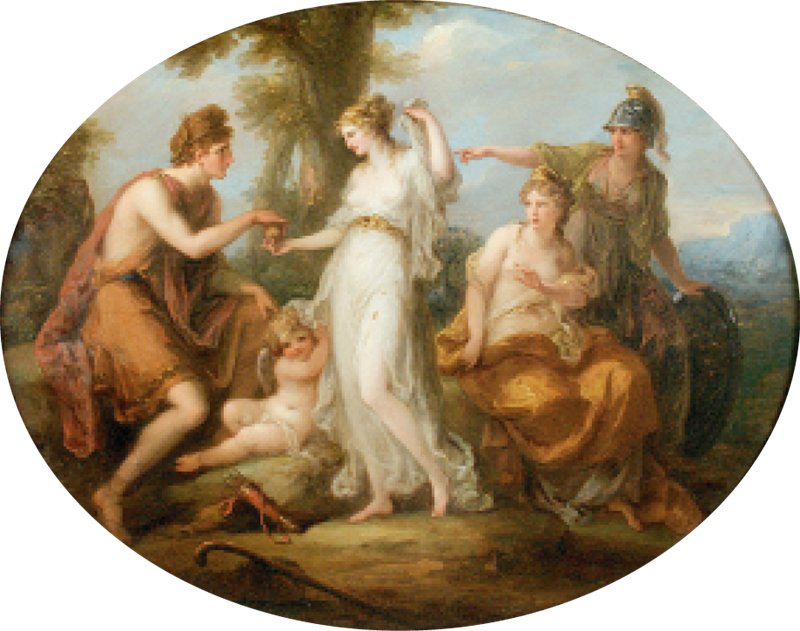 На картине художницы XVIII века Ангелики Кауфманн мы наблюдаем заключительный акт суда Париса, сына троянского царя, которому предстояло решить, чего же он хочет и от какой богини, а заодно выбрать наипрекраснейшую. Гера обещала ему власть над всей Азией, Афина – военную славу и победы, Афродита же – любовь женщины, Елены, дочери Зевса и Леды.