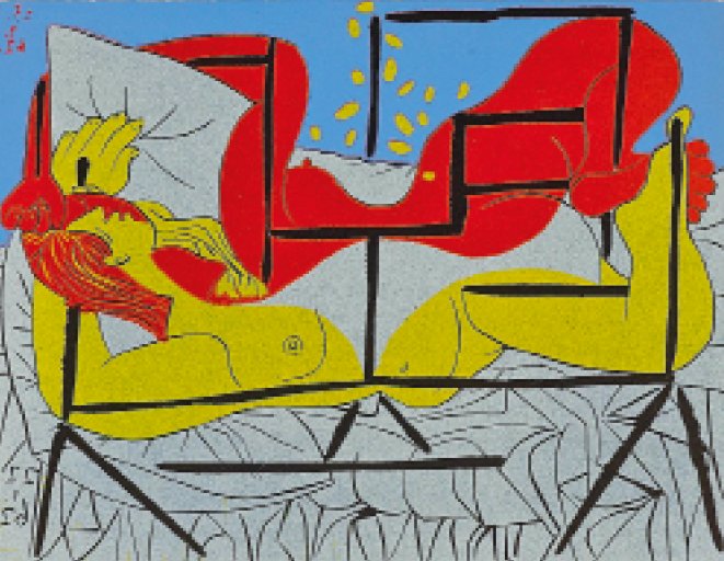В том, чтобы передать эротичность без явных форм, Пикассо был мастер. Мы видим лишь желто-оранжевое тело, изгибающееся на постели, и падающие на него желтые лепестки.