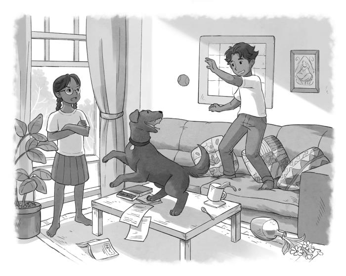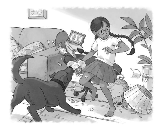 – Это всё из-за тебя! Сейчас же отведи Шипучку на задний двор! – закричала Кийя, кидаясь подбирать осколки. К собственному ужасу, она случайно наступила на горсть читос на полу и втоптала их в ковёр. – Вдруг собака наступит на стекло и порежется!