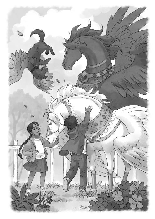 Но Кинджала, похоже, совершенно не волновало, что семья Лолы или другие соседи заметят их друзей-пакхираджей. А не заметить двух большущих коней с гигантскими крыльями будет очень непросто! На пакхираджах была сверкающая драгоценными камнями сбруя, с голов свисали позвякивающие украшения. Не было только сёдел. И, как на собственном опыте убедились близнецы во время приключений в мультивселенной, красота не мешала Раату и Снежку быть яростными бойцами и верными товарищами.