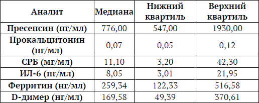 У троих больных (2 женщин и 1 мужчина) заболевание закончилось летальным исходом. У всех пациентов отмечалось значительное повышение концентрации пресепсина – 1193 пг/мл, 2982 пг/мл и 838 пг/мл соответственно, в сочетании с другими маркерами воспаления.