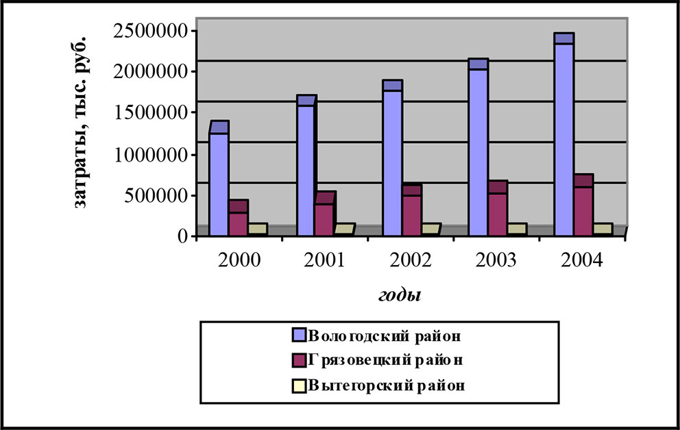 Продуктивное сельское хозяйство в современном мире не может существовать без участия государства. В разных регионах оно организуется по-разному. Например, рассматривая ситуацию 2000 года по Вологодской области всего было выделено затрат на производство продукции сельского хозяйства порядка 4 млн. рублей. Наибольшая доля финансирования была направлена на Вологодский район – 32 % от общей суммы затрат, второе место по объему финансирования занимает Грязовецкий район – 8 %, а менее всего финансируется Вытегорский район – 0,6 %. Финансирование в 2004 году увеличилось на 85 %. Прослеживается общая тенденция увеличения объёма затрат на производство продукции сельского хозяйства (рис. 1, 2).