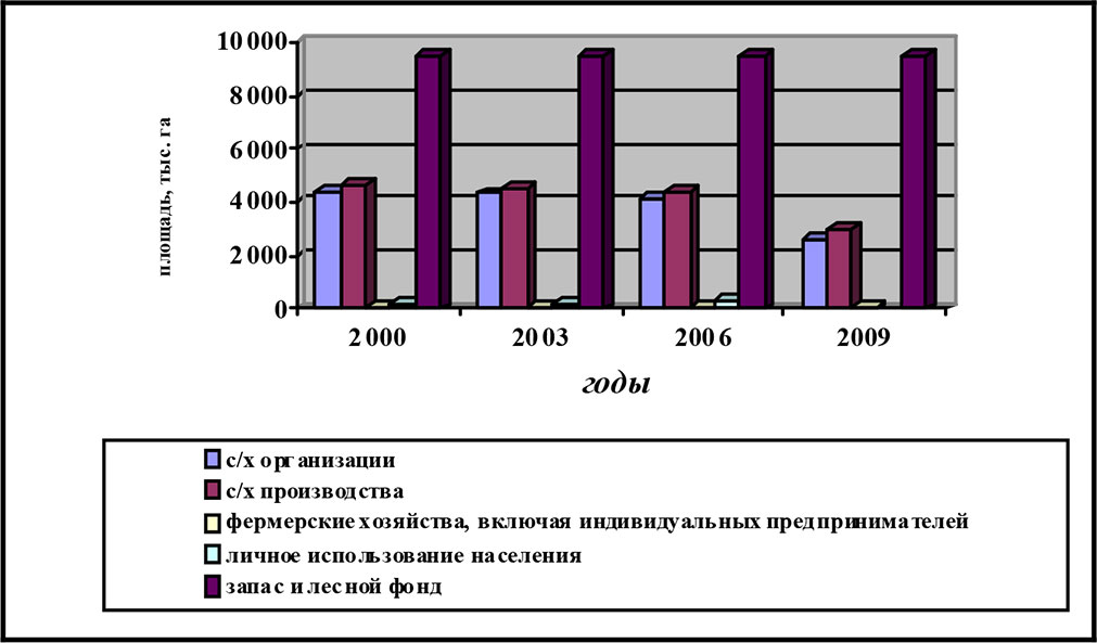 Принимая во внимание ситуацию 2000 года по Вологодской области можно отметить, что общая площадь земель составила порядка 14,5 тыс. га, среди них было использовано землепользователями, включая сельхозорганизации, сельхозпроизводства, крестьянские (фермерские) хозяйства и индивидуальных предпринимателей – 48 %, земли в личном использовании населения – 1 %, земли запаса и лесного фонда – 51 %. Спустя 10 лет земли сельхозорганизаций, сельхозпроизводств, крестьянских (фермерских) хозяйств и индивидуальных предпринимателей сократились менее чем в 2 раза, земли в личном использовании населения увеличились более чем в 2 раза, при этом земли запаса и лесного фонда незначительно увеличились.