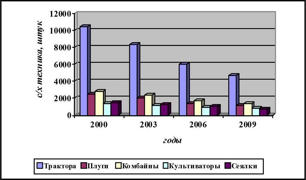 Парк сельхозтехники Вологодской области на 2009 год насчитывал порядка 5 тыс. тракторов, 1 тыс. плугов, 800 культиваторов, 750 сеялок, 1,5 тыс. комбайнов, что составляет ½ парка по состоянию на 2000 год. Таким образом, наблюдается тенденция не только в снижении единиц сельхозтехники, но и в её изношенности (рис. 3).