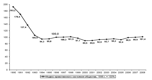 Как видим, динамика негативная со слабо выраженной тенденцией к улучшению в последние годы. Особенно выражено негативное нравственное состояние современного российского общества, если сравнивать его с ситуацией перед реформами – в 1990 г., что вынуждает сделать малоутешительный вывод: морально-нравственному состоянию нашего общества реформы на пользу явно не пошли.