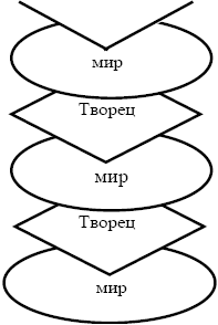 Но не исключено, что аналогичным образом и исследователь вместе со всеми другими людьми, т. е. все человечество, представляет собою нечто вроде муравейника, который является объектом экспериментов некоего сверхчеловеческого существа, которое столь же превосходит по своим возможностям людей, насколько люди превосходят муравьев. Оно, очевидно, может представляться людям таким же Богом, каким наш исследователь выступает для муравьев. Вера в существование этого Бога выражается в религии. А атеисты считают возможным жить, действовать и строить науку, не обращаясь к этой вере и считая, что наш мир «не создан никем из богов и никем из людей» (Гераклит). Если же это не так, то можно, далее, предположить, что высшее существо, являющееся творцом нашего мира, тоже, подобно нам, живет в каком-то своем материальном мире, подчиняется его законам и, подобно нам, далеко не всесильно. И оно само тоже может быть как атеистом, так и верующим. Можно пойти дальше и предположить, что миром этого существа правит существо более высокого ранга, которое живет в мире еще более высокого порядка и т. д. до бесконечности (см. рис.).