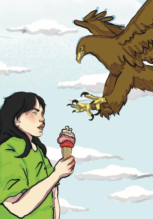 Однажды Катя сидела и уплетала мороженое «Десант здоровья», самое вкусное и полезное мороженое. И вдруг увидела в небе коршуна, который резко снизился и схватил когтями добычу Наташи.
