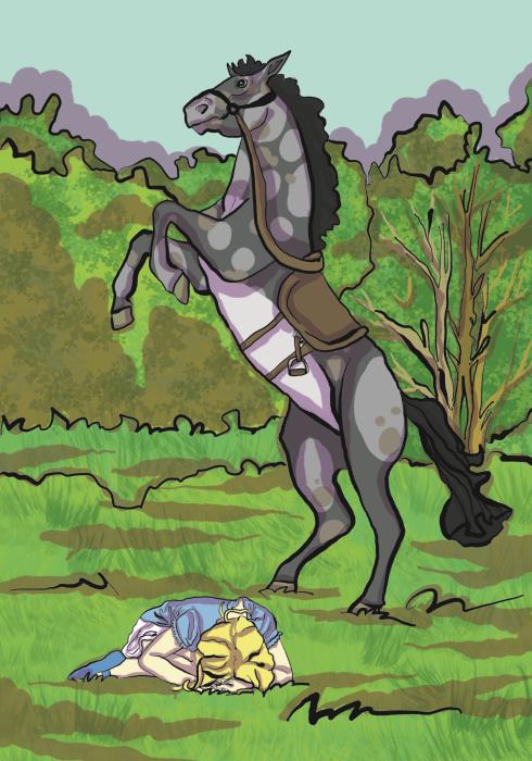 Но не успела получить ответ, как навстречу выскочил мотоциклист и поддал газа. Резкий шум испугал лошадей, а лошадь Кати поднялась на дыбы, встав на задние ноги, устремившись в небо, а Катя, маленькая куколка, слетела на землю. Лошадь прыгает вокруг неё, ноги её мелькают, вот-вот могут и стукнуть, раздавить Катю. Инструктор пытается кричать лошади, успокоить, но её лошадь тоже неспокойна. Хорошо, что дедушка спрыгнул на землю и за ноги оттащил Катю в сторону, в шиповник, так что несколько острых иголок впились ей в тело. Потом поймал её коня, а там и инструктор появилась на земле. Привязали лошадей к деревьям, а дедушка вытаскивал иголки из тела внучки.