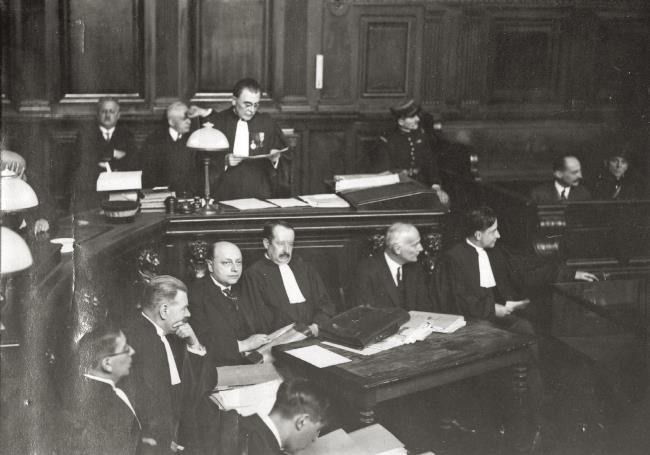 С. Кампинчи, В. де Моро-Джиаффери (?), С. Б. Членов, П. М. А. Бертон, А. Грубер (?), М. Гарсон; на скамье подсудимых – Савелий Литвинов